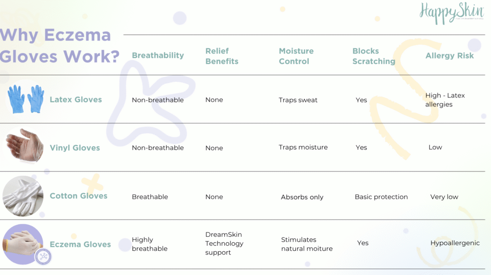 Regular cotton gloves provide basic scratch protection. HappySkin eczema gloves actively heal the skin using patented DreamSkin technology. It’s the difference between covering up a problem and actually addressing it.