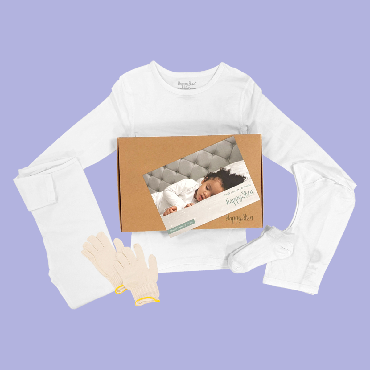 The HappySkin Everything Eczema Child Pack contains all the garments you need to soothe your little one’s eczema skin from head to toe. Its super soft fabric and out outward-turned hems ensure the best possible fit.